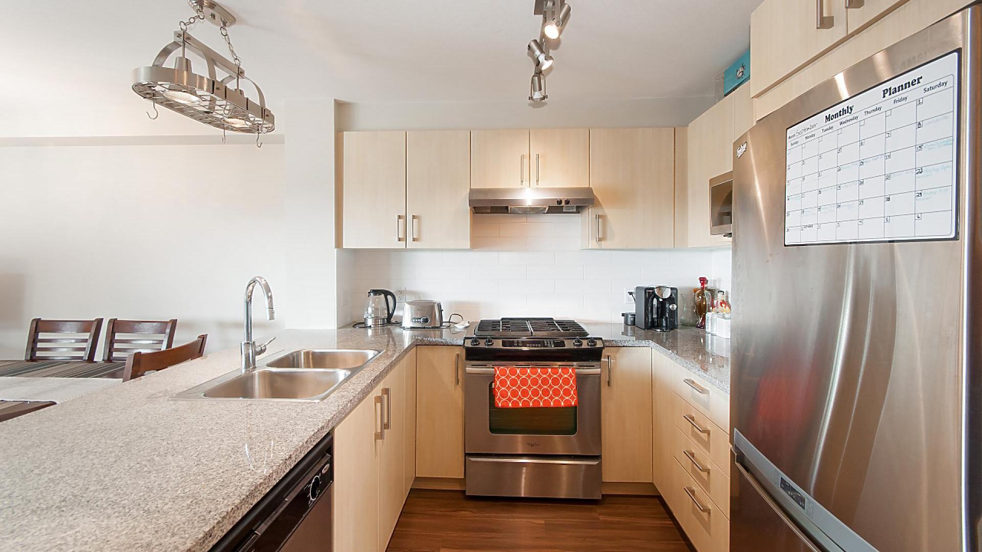 This one Bedroom, one Bathroom home offers bright, open plan living with contemporary finishes. The Kitchen features granite countertops and stainless steel appliances, including a gas cooker and plenty of storage. Enjoy warm laminate flooring throughout and views of the green space from the Living and Dining Rooms. Sliding doors lead to your large, sunny balcony for a barbeque and glass of wine! Enjoy membership to the Timber Clubhouse, a private residents-only Clubhouse offering resort-style recreation including an outdoor pool, whirlpool, sauna, terrace deck, fully-equipped gym and games room. Centrally located at the base of Westwood Plateau, Tamarack is within easy access of all levels of schools, transit and amenities. Walk to Evergreen SkyTrain station, LaFarge Lake, the Coquitlam Centre Mall, Pinetree Secondary and Douglas College. This home comes with one underground parking space and plenty of visitor parking. Pets and rentals welcome - this is a great investment opportunity that won't last!